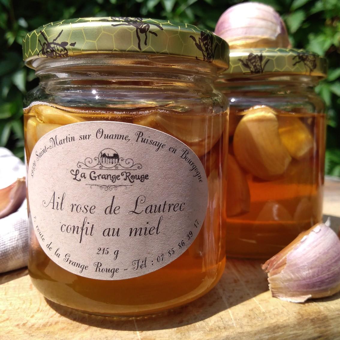 Ingrédients : Ail rose de Lautrec AOP, miel d'été de la Grange Rouge. Chaque pot contient environ une tête d'ail.