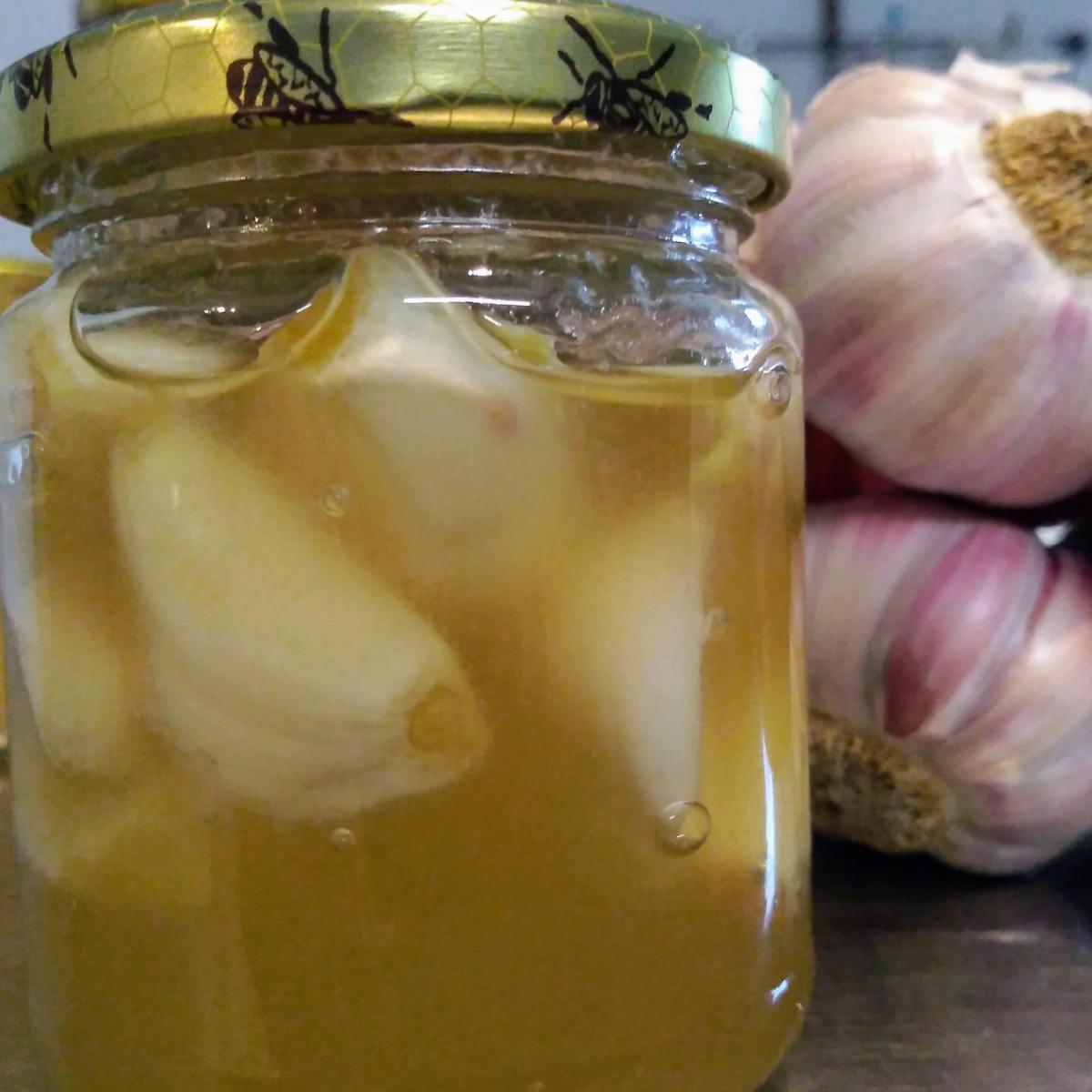 Une des techniques de conservation des aliments consiste à les faire confire dans du sucre ou … du miel. C'est le cas de cet ail rose qui se conservera des années dans le miel. N'ayant pas subit de cuisson, les ingrédients conservent leurs qualités originelles. La lente fermentation du miel due à l'humidité de l'ail génère des saveurs à la fois puissantes et subtiles. L'ail confit se bonifiera au fil des ans en développant ses arômes rappelant l'ail noir. La capsule légèrement bombée indique que la fermentation continue son œuvre.
