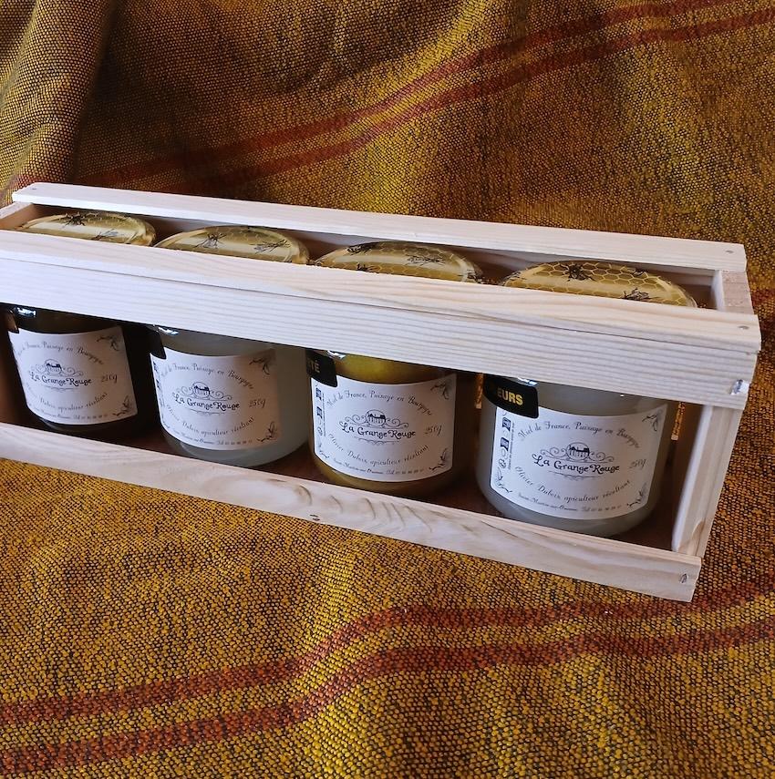 Joliment présenté dans son coffret en bois, cet assortiment de miels de la Grange Rouge est aléatoire, selon stock disponible. Un cadeau gourmand et 100% nature…