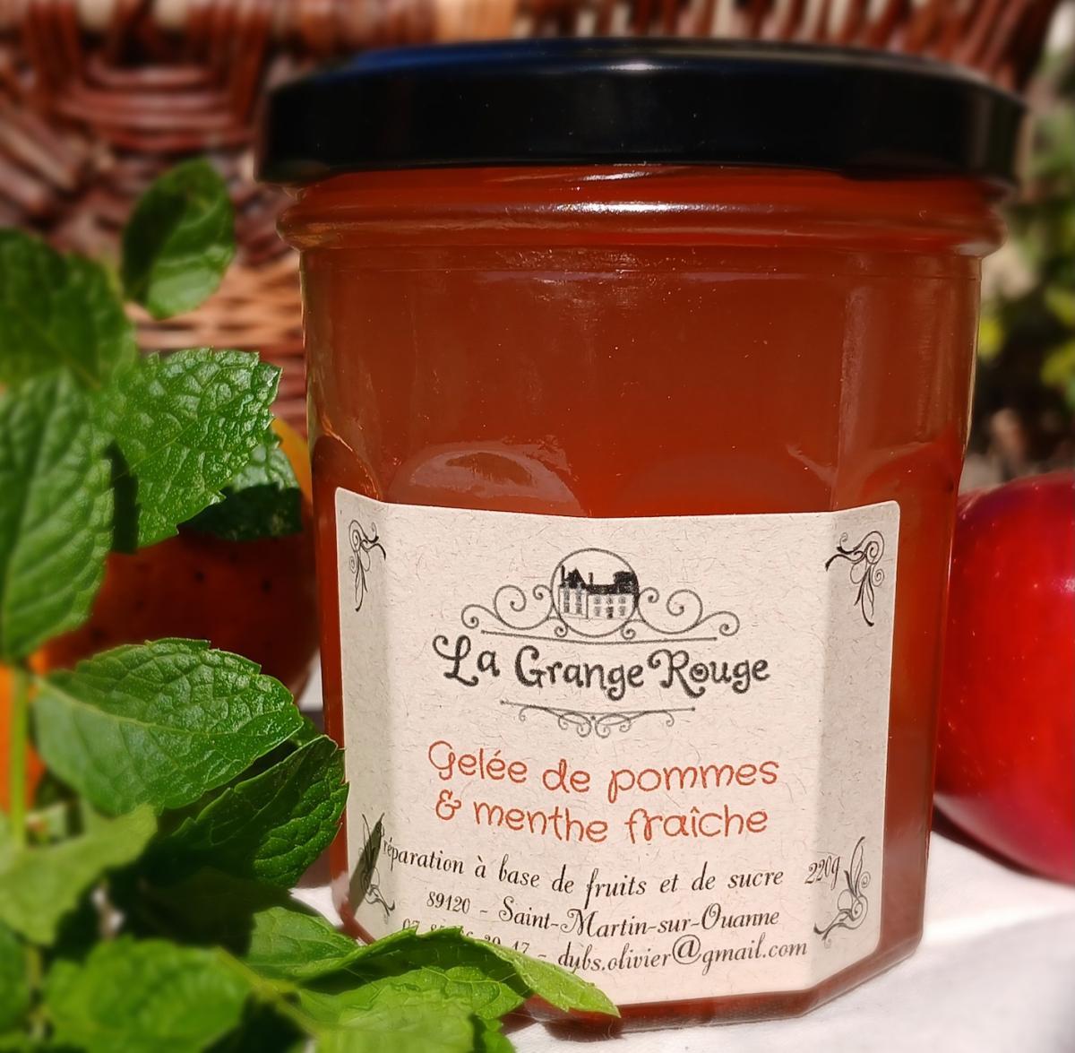 Cette belle gelée est préparée à partir de trois variétés de pommes de mon verger, dont une magnifique pomme rouge très juteuse et parfumée. L'idée de faire infuser dans le jus des pommes des feuilles de menthe fraîche m'est venue en suçant un bonbon associant ces deux saveurs. Le résultant est aussi beau que bon : la peau des pommes rouges (zéro traitement bien sûr, comme tous les fruits de la Grange Rouge) apporte une teinte rosée à la gelée. Côté palais, après la saveur acidulée de la pomme vient la délicate note de fraîcheur de la menthe du jardin. Une gelée subtile et délicate qui mérite bien une belle tranche de brioche ou un croissant. Et pourquoi pas quelques explorations culinaires, en déglaçage d'une viande grillée ou en accompagnement de viande blanche, veau ou volaille ?