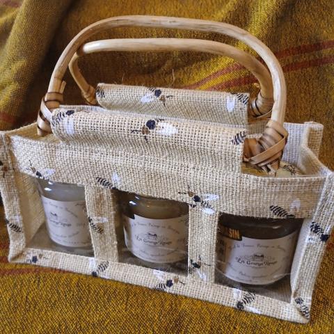 Joliment présenté dans son sac et toile de jute imprimé de motifs d'abeille, cet assortiment de miels de la Grange Rouge est aléatoire, selon stock disponible. Un cadeau gourmand, original et esthétique…